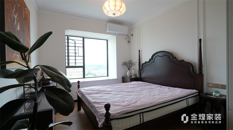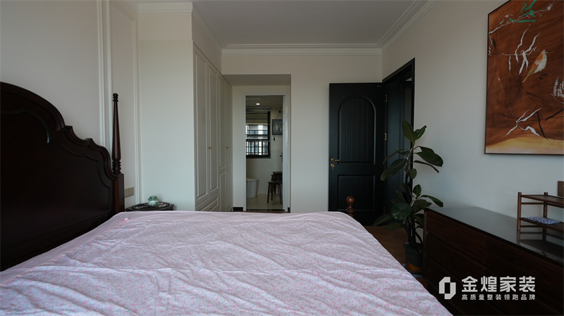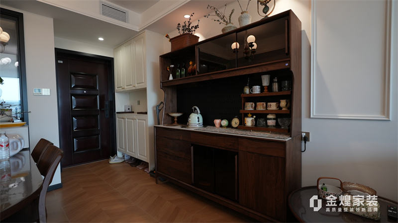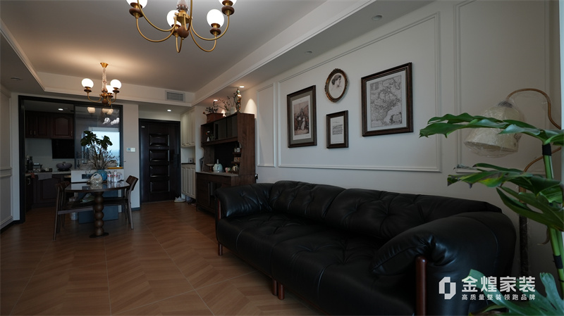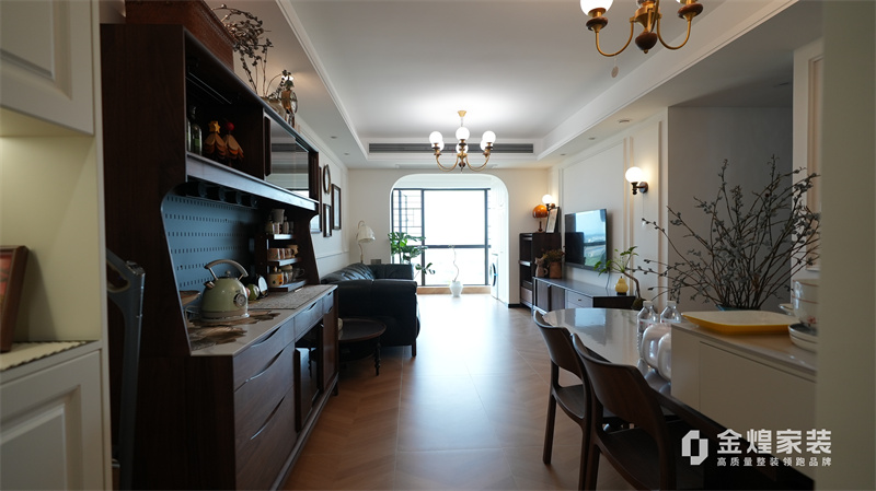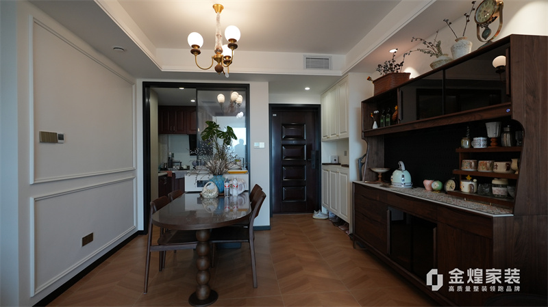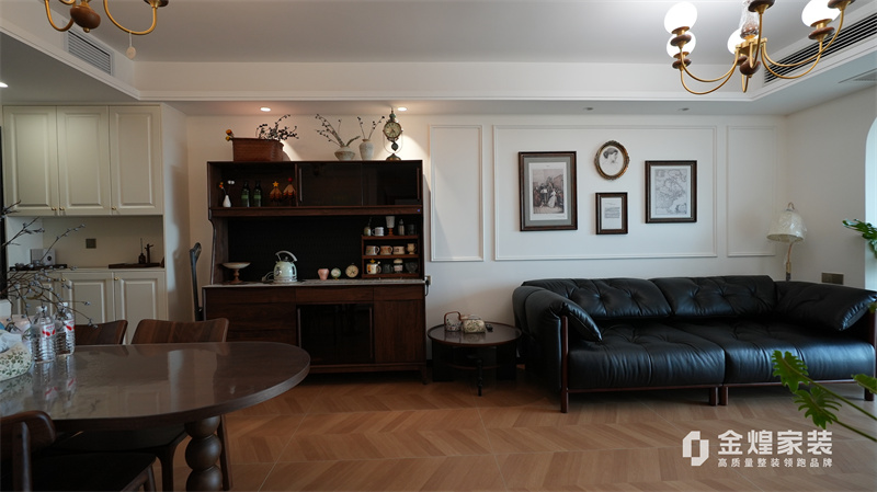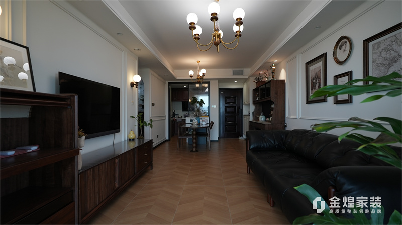 從客廳的深色皮質沙發、木質電視柜,到餐廳的玻璃餐桌、深色餐邊柜,再到臥室的白色衣柜、深色木質床,都體現了中古風格對材質和色彩的選擇偏好。