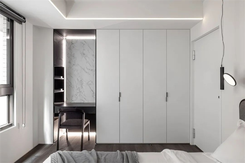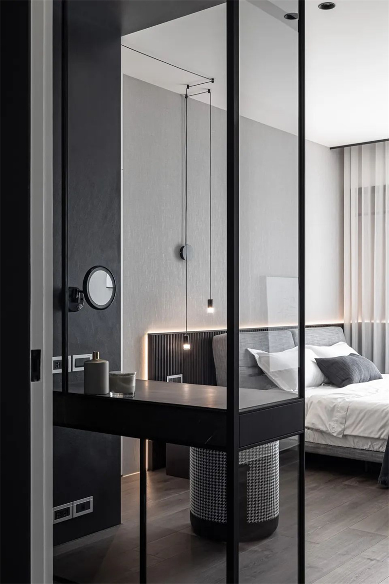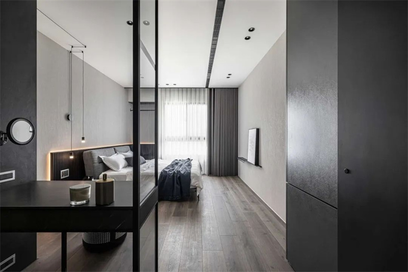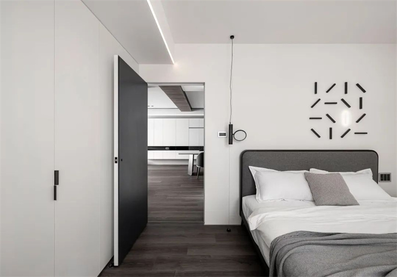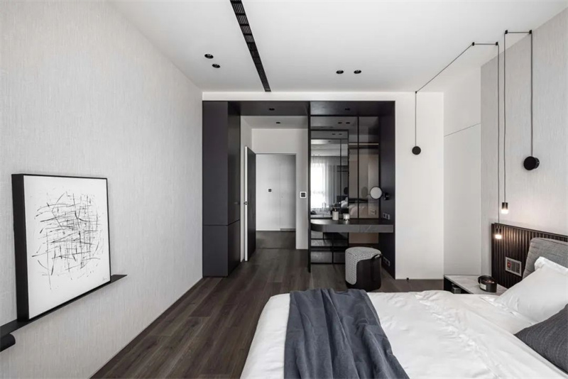次臥延續(xù)了黑白灰的主色調(diào),床頭一側(cè)的黑色幾何吊燈,以簡(jiǎn)約的設(shè)計(jì)凸顯現(xiàn)代感,柔和的光線為房間注入了一絲溫暖。簡(jiǎn)潔的床頭背景墻上做了抽象裝飾設(shè)計(jì),與房間的整體氛圍完美契合,增添了一抹藝術(shù)氣息。