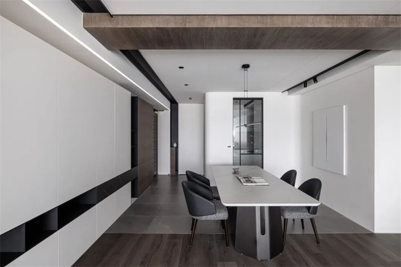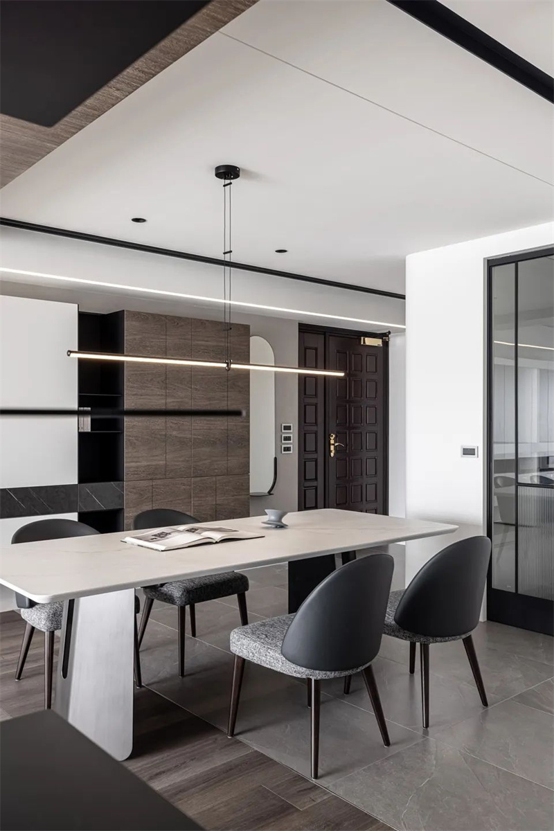 餐廳以簡(jiǎn)約的餐桌和現(xiàn)代餐椅為特色,白色墻壁和深色的定制柜創(chuàng)造了一個(gè)純凈的用餐環(huán)境。餐桌上方懸掛著一盞簡(jiǎn)約的金屬吊燈,柔和光影灑落在餐桌上,營(yíng)造出溫馨的用餐氛圍,讓人感受到現(xiàn)代風(fēng)格的精致與高雅。