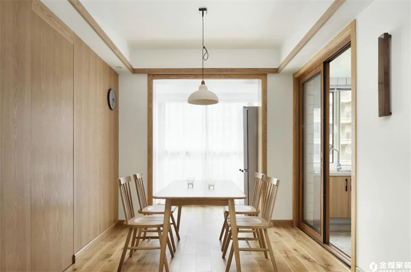 餐廳延續了原木風格的溫潤與自然,木質餐桌和椅子以簡潔的線條設計呈現,展現出一種質樸而不失現代感的美。柔和的燈光灑落在餐桌上,營造出舒適且溫暖的用餐氛圍。