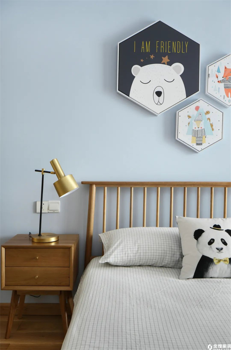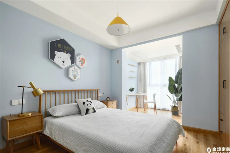 兒童房在原木風格的基調上,加入了更多活潑明快的元素。陽臺光線明亮,陽光灑滿整個空間,使房間充滿了溫暖和生機。陽臺一側設置了一張簡潔的原木書桌,書桌靠窗,孩子可以在自然光下進行學習和閱讀,充分享受清新的室外景色。
