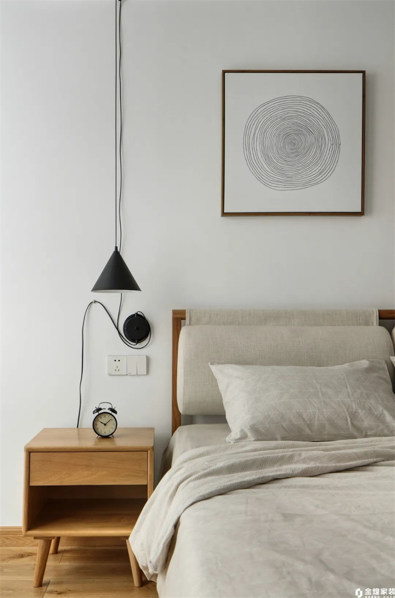 主臥墻面采用淺米色,搭配天然木質的藝術掛畫作為床頭背景,質樸自然。簡約的原木床架與柔軟的棉麻床品相互呼應,讓整個空間充滿舒適感。