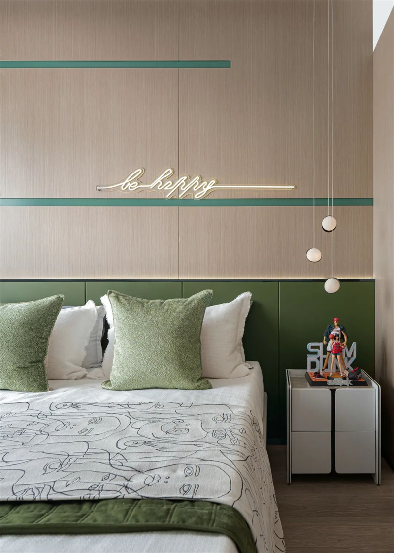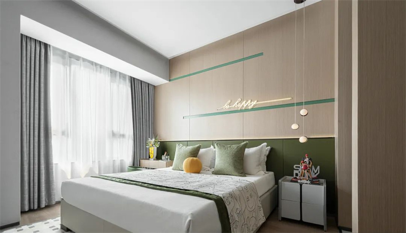 主臥,簡潔而溫馨的設計讓人放松。寬敞的大床搭配柔軟的床品,營造出舒適的休息空間。床頭背景墻采用淺木色與綠色相間的色調,既時尚又充滿生機。兩側對稱擺放的白色床頭柜設計簡約實用,上面擺放著綠植和裝飾品,增添幾分生活氣息。