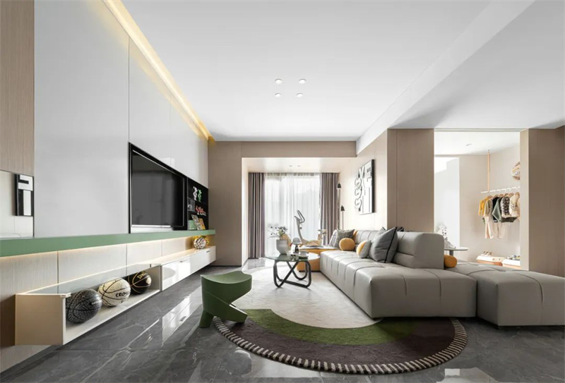 客廳,寬敞明亮的空間布局讓人感到格外舒適。L型灰色皮質沙發搭配色彩各異的靠墊,既實用又美觀。電視墻采用了嵌入式電視機與白色儲物柜的設計,既節省空間又提升了整體現代感。精心設計的燈具提供均勻柔和的照明,使整個空間更加溫馨。