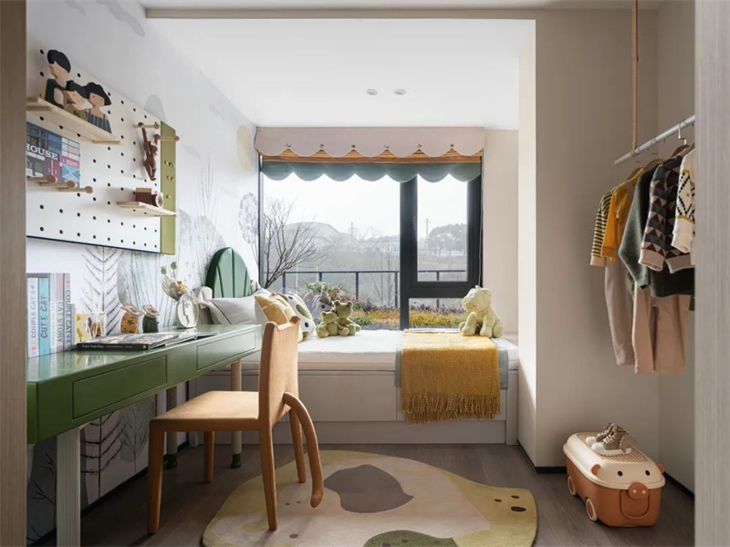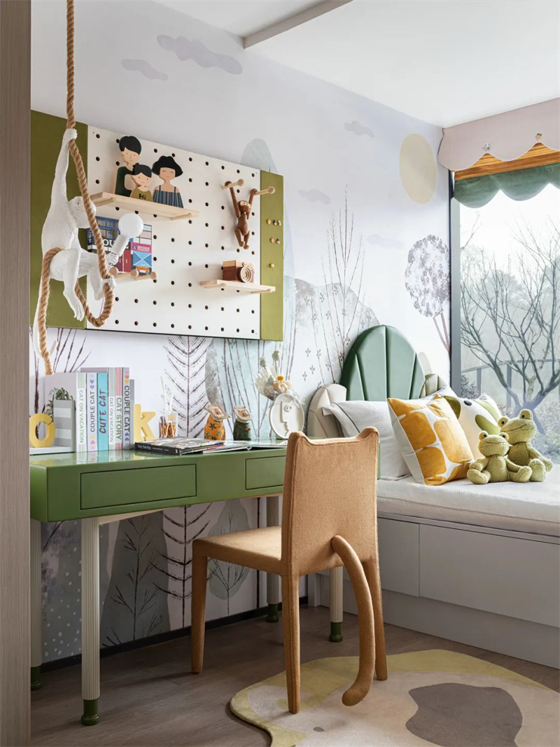 兒童房墻上可愛的卡通圖案和云朵壁畫,營造出夢幻般的氛圍。綠色學習桌搭配木質椅子,為孩子提供了一個既實用又美觀的學習空間。大窗戶讓充足的自然光進入房間,使整個空間更加明亮通透。孩子們可以在這里安全地玩耍、學習,享受成長的樂趣。