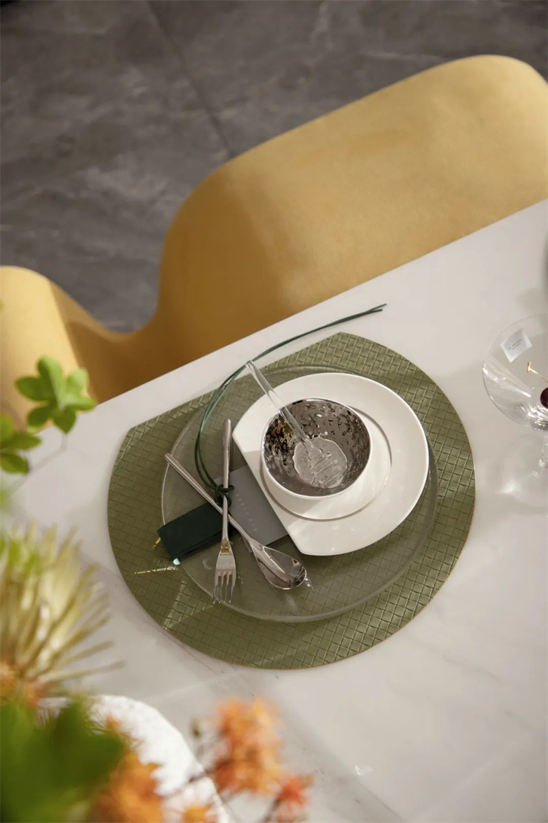 餐廳,簡潔而優雅的設計讓人眼前一亮。灰色大理石地板與淺色墻面形成鮮明對比,營造出清新高雅的氛圍。墻上的大幅抽象畫作成為視覺焦點,色彩鮮艷且富有藝術感,為整個空間注入了活力。