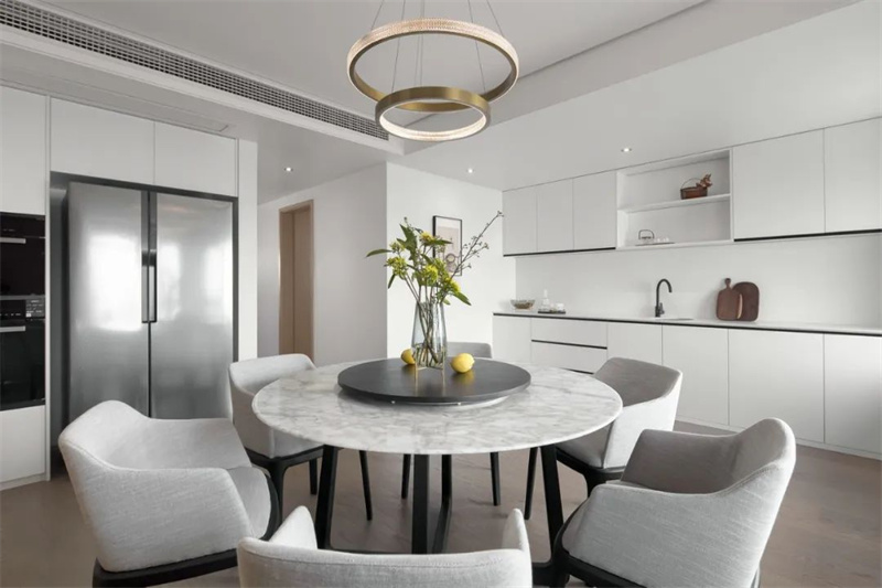現代風格的餐廳延續整體簡約基調,圓形大理石餐桌搭配灰色餐椅,質感溫潤又不失高級感。上方雙層圓環吊燈造型獨特,暖光灑落,營造出溫馨的用餐氛圍。一旁的墻面裝飾與開放式置物架增添生活細節,功能與美感兼具。