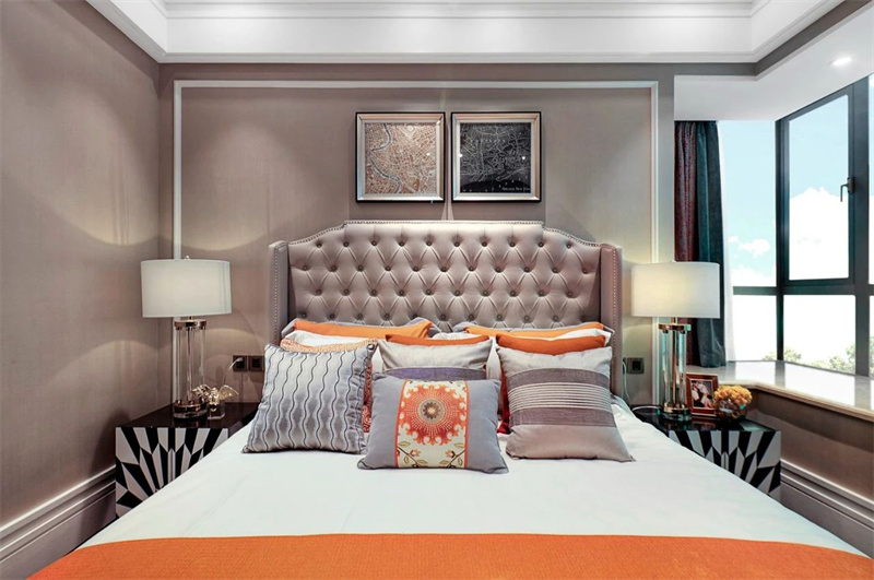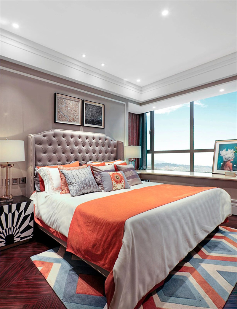 主臥中,優雅與奢華交織成了一幅夢幻的畫卷。床頭采用軟包設計,柔軟的天鵝絨床品與大飄窗相互呼應,金屬邊框的鏡子與床頭柜上簡約的臺燈為臥室增添了一絲現代感,同時保持輕奢的調性,使空間既舒適又不失格調。