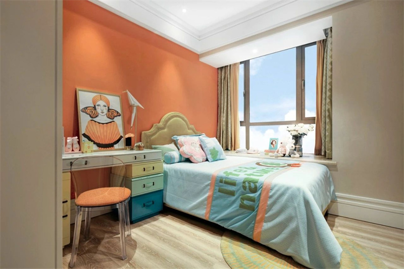 兒童房充滿溫馨與活力,設計簡潔卻極具趣味性。房間的主色調以橙色為主,配合原木色地板,營造出輕松愉快的氛圍。床頭設置了一張書桌,陽臺明亮的光線灑入室內,為孩子提供了理想的學習和游戲區域,增添了童趣和活力。