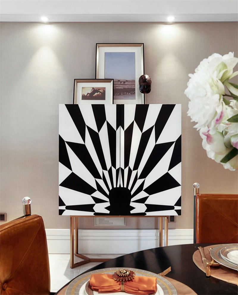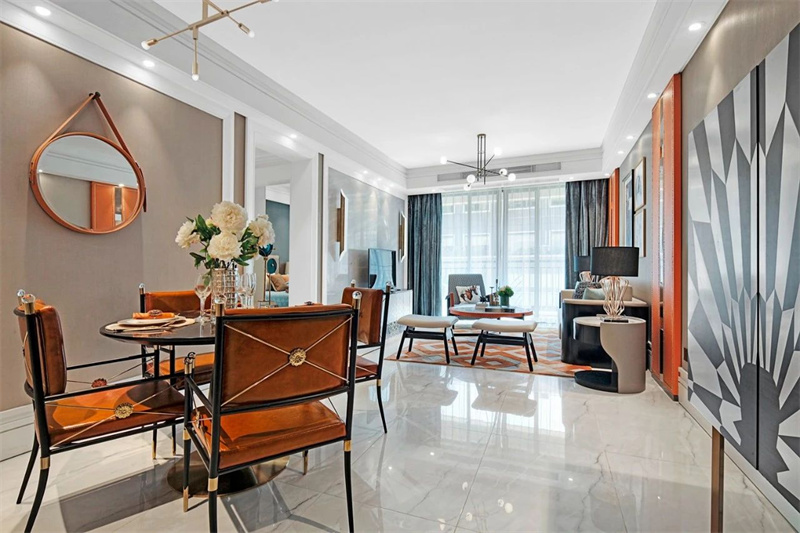 餐廳設計講究細節與品質的融合。中央的餐桌簡潔大氣,圍繞它擺放著幾張極具辨識度的愛馬仕橙色餐椅,與同色系的裝飾品相互呼應,為餐廳增添了一絲活力和時尚感。餐桌上精致的餐具與花藝裝飾,為每一餐的時光賦予滿滿的儀式感。