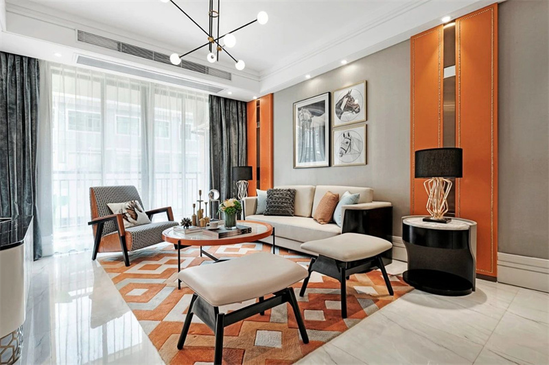 客廳的設計完美詮釋了法式輕奢的精髓,一張極具視覺沖擊力的愛馬仕橙色地毯鋪陳于大理石地面上,與淺米色的沙發和金屬質感的茶幾形成鮮明對比,營造出層次分明的視覺效果。柔和的燈光與古典裝飾掛畫,為整個空間增添了一份溫暖的浪漫氛圍。