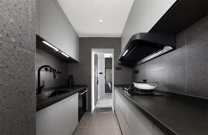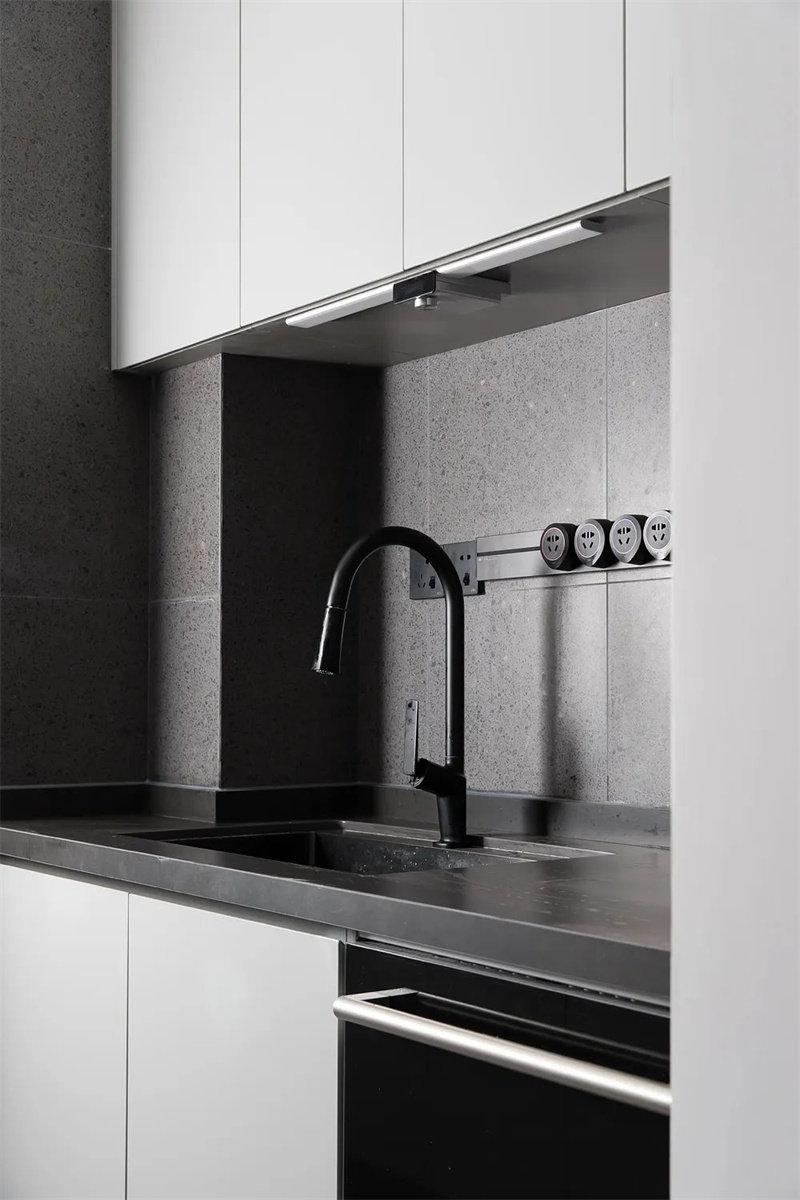 廚房是一個(gè)完美的結(jié)合了功能性和美學(xué)的空間。清潔的線條和簡(jiǎn)約的設(shè)計(jì)元素在這里主導(dǎo),灰色的定制櫥柜提供了充足的儲(chǔ)存空間,同時(shí)保持了整個(gè)空間的干凈度。智能燈光和智能廚房電器的使用,提高了生活的便利性,為業(yè)主打造一個(gè)理想的烹飪空間。