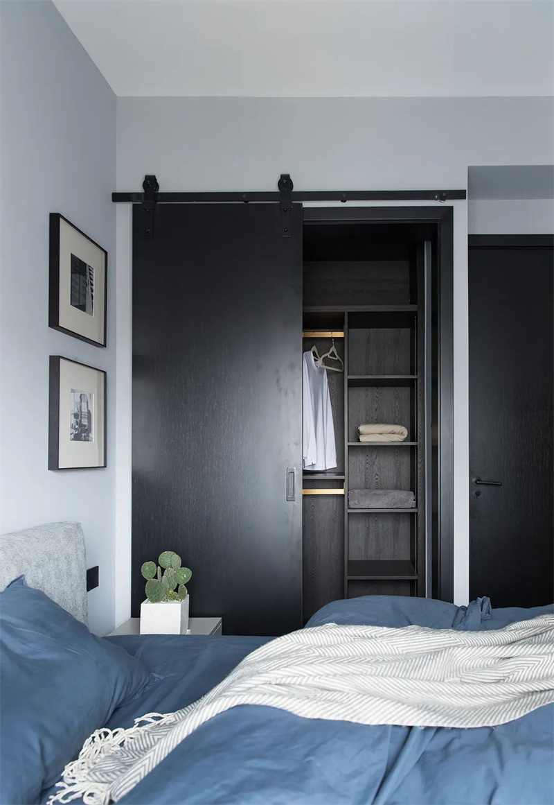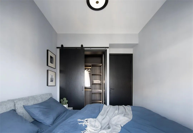 主臥室延續(xù)了整體的極簡(jiǎn)風(fēng)格,以淺灰色和白色的搭配為主,消除了多余的裝飾元素。深色的定制柜和藍(lán)灰色的床品為臥室注入了寧?kù)o的舒適感。通過精心設(shè)計(jì)的照明,臥室的空間質(zhì)感和氛圍得以突顯,使簡(jiǎn)潔的設(shè)計(jì)與窗外的自然景色相得益彰。