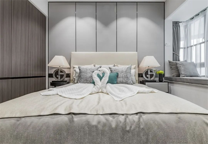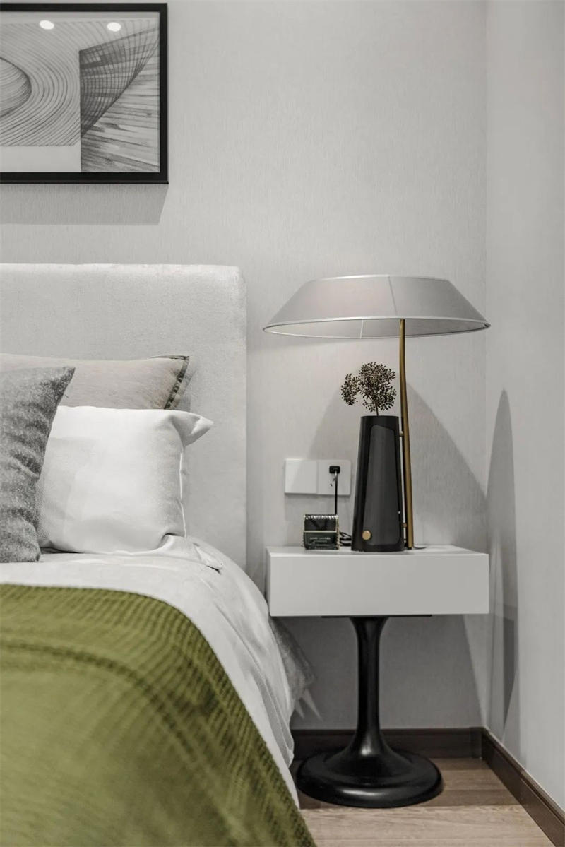 臥室精心挑選了高品質的床具,柔和舒緩的色調給人寧靜的感覺。搭配柔軟舒適的床品和軟裝,保證了睡眠質量。同時,考慮到大空間的照明需求,臥室布置的燈具都以溫柔的意象為主題,為空間營造了貼心的守護感。