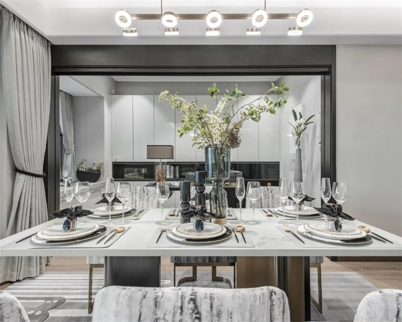 餐廳延續了客廳的風格,餐邊柜將定制柜的美觀與實用性發揮得淋漓盡致?,F代感十足的燈具將溫暖的光線投射到大理石餐桌和布藝餐椅上,營造出舒適的用餐氛圍。