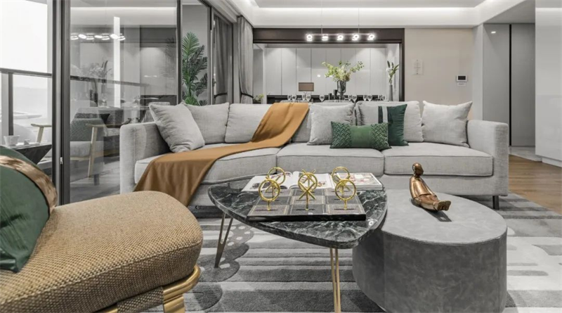 本案采用灰白中性色搭配原木地板為主色調,營造清新簡約的空間氛圍。室內家具選用了簡約設計的灰白色系,搭配金屬材質的細節裝飾與綠植,使整體空間更顯現現代感和奢華感。