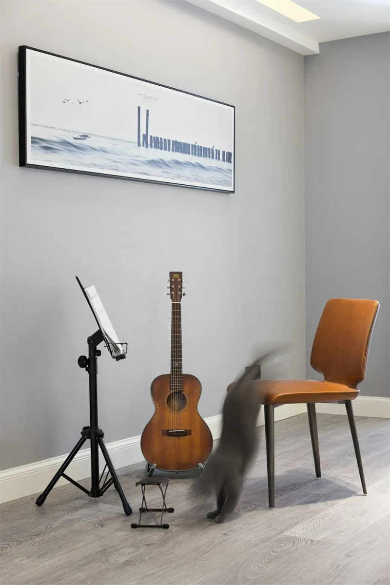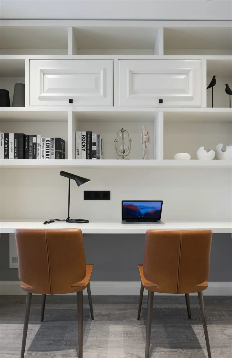 現代簡約的書房注重實用性和整體協調性。純白書桌和書架組合,打造出一個明快而整潔的學習空間。舒適的椅子、明亮的臺燈以及一些簡約的掛畫與樂器裝飾,讓這個空間兼具工作與休閑的功能。