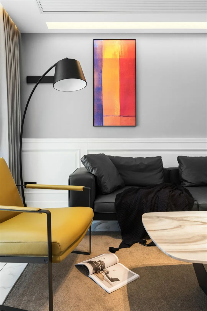 客廳主色調采用灰白墻面與白色大理石地磚搭配,創造出通透明亮的空間感。低調的深色調沙發展現簡約品味。通過一些精致的極簡設計裝飾畫和空間擺件,為整個客廳注入一絲藝術氛圍。