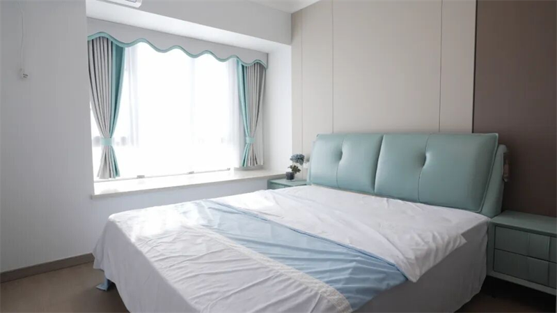 主臥以柔和色調營造寧靜舒適的睡眠空間,淺灰與木色背景墻搭配湖綠色軟包床頭,清新雅致。同色系床頭柜與衣柜設計協調統一,簡潔實用。大窗配淺色紗簾與波浪邊窗簾,采光充足又不失溫馨。整體布局清爽有序,讓臥室成為放松身心的理想休憩之所。