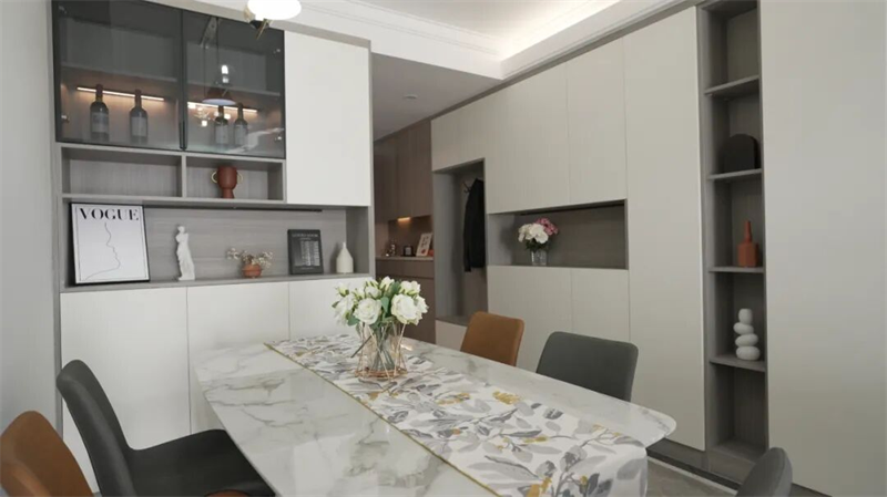 餐廳以現代簡約風格打造,淺灰色墻面與大理石餐桌相得益彰,搭配不同色調的皮質餐椅,簡潔又富有層次。餐邊柜采用玻璃門與開放格設計,內置燈帶,兼具收納與展示功能。一束鮮花點綴桌面,增添生活氣息。空間與客廳自然連通,動線流暢,營造出溫馨舒適的用餐氛