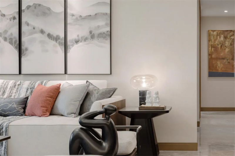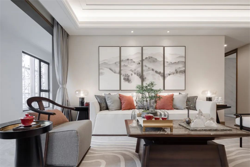 整個(gè)客廳以淺色為主調(diào),巧妙地搭配深色家具和傳統(tǒng)中式擺件,營造出優(yōu)雅別致的氛圍。中央擺放一張紅木茶幾,而沙發(fā)背景墻則裝飾著一組水墨山水畫,將寧靜和諧的氛圍完美呈現(xiàn)。