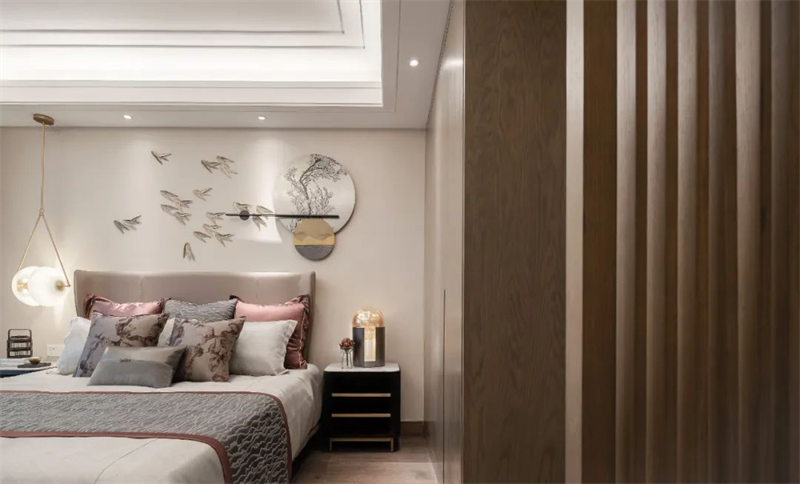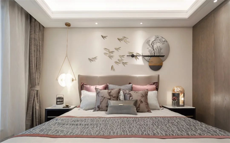 主臥傳統(tǒng)的中式元素與現(xiàn)代的簡約設(shè)計(jì)完美結(jié)合,呈現(xiàn)出典雅與舒適的空間氛圍。東方韻味的床頭背景裝飾,加上簡約時(shí)尚的吊頂和燈飾,融合了新中式和現(xiàn)代元素,呈現(xiàn)出獨(dú)特的古典美感。使整個(gè)空間在保留傳統(tǒng)文化精髓的同時(shí),更顯現(xiàn)代時(shí)尚。