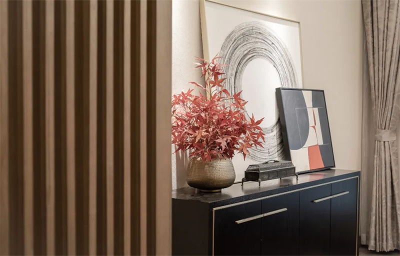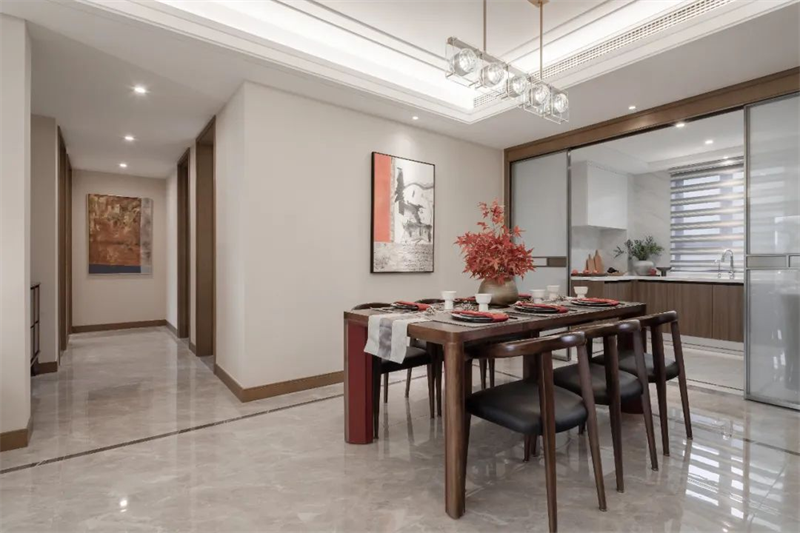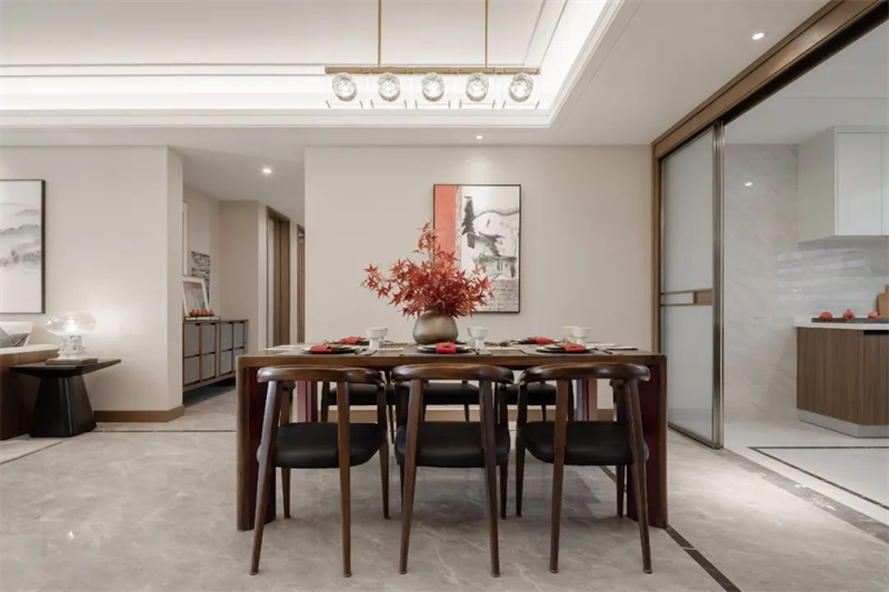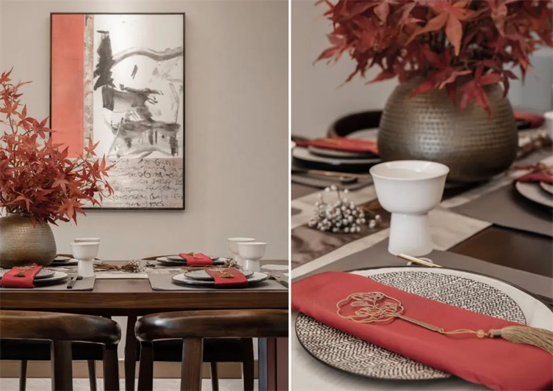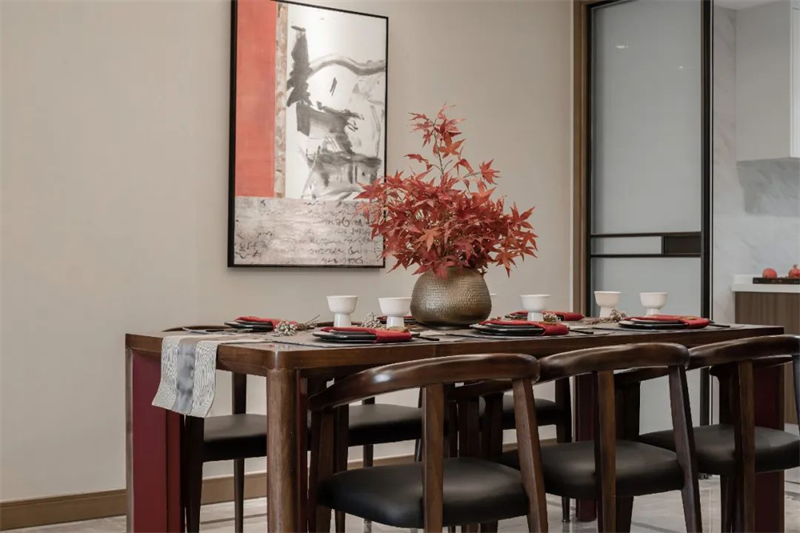餐廳的餐桌椅采用原木材質(zhì),融合傳統(tǒng)工藝與簡約線條,獨(dú)具匠心。餐桌上擺放著精致的餐具和紅楓盆栽,墻面懸掛著一幅傳統(tǒng)水墨風(fēng)畫作,充滿東方韻味和現(xiàn)代雅致的裝飾細(xì)節(jié),讓空間散發(fā)著獨(dú)特的魅力。