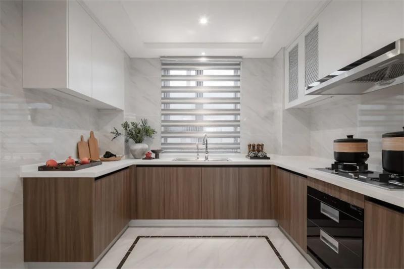 廚房“U”字形的櫥柜設(shè)計(jì),完美的動線讓空間整潔有序,定制的嵌入式廚電設(shè)計(jì)讓操作更加便捷。典雅的大理石臺面與淡雅的木紋櫥柜完美配合,使整個(gè)廚房設(shè)計(jì)更加自然和諧。