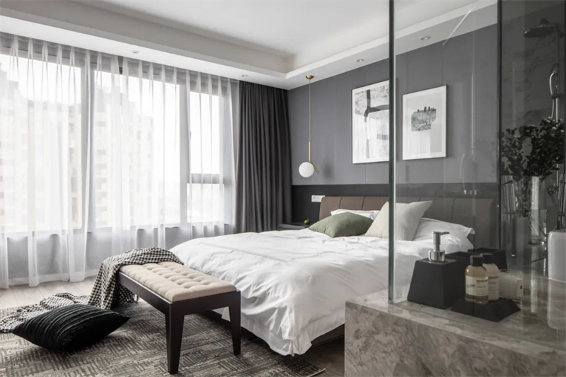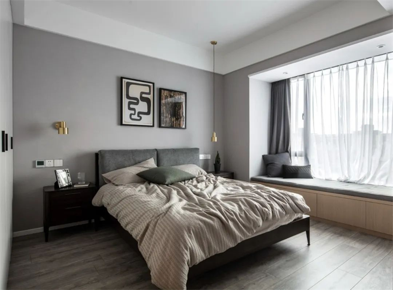 主臥室以灰色為主,地板+墻面、包括床上用品,都采用了白色和灰色的組合。床頭柜和背景是黑+灰組合,為空間增添了一些深色元素。窗簾選用了白色透明面料,確保充足的自然光線進入房間。