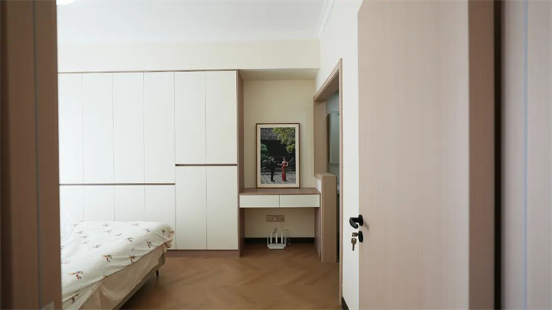 主臥以極簡線條勾勒出寧靜的休憩空間,延續原木奶油風的溫柔基調,營造出如云朵般輕盈的睡眠氛圍。通頂式奶油白衣柜搭配淺木色邊框,簡約而不失設計感,巧妙隱藏收納,讓空間整潔有序。床品選用清新印花圖案,點綴一抹童趣與生機,與窗邊一束鮮花相映成趣,喚醒生活的詩意。