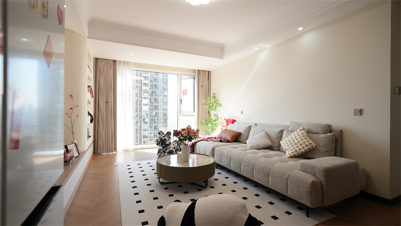 客廳里,米白沙發搭配幾何地毯,點綴一抹紅喜字與熊貓玩偶,傳統與童趣悄然融合,讓家在簡約中透出滿滿溫度與個性。這不僅是一次裝修,更是一種松弛而有愛的生活方式的開啟。